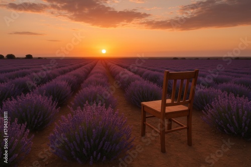 Fototapeta premium Lavender Field with Empty Wooden Chair Facing Horizon — Contemplative Sunset...
