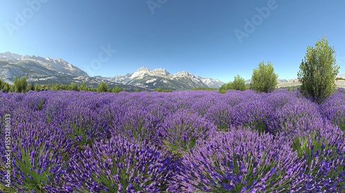 Naklejka premium Lavender field with majestic mountains under a clear blue sky during midday