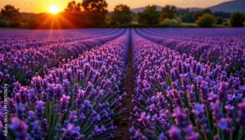 Fototapeta premium Lavender Fields at Dusk Endless rows of lavender beneath a glowing sunset,...