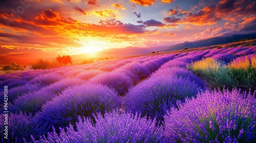 © pattaphorn, Fototapeta premium Lavender Fields at Sunset