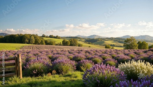 Fototapeta premium Lavender fields basking in spring sunlight, countryside tranquility