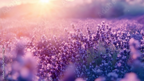 © Terablete, Naklejka premium Lavender fields bloom at sunset in a tranquil landscape of vibrant purple hues and soft sunlight