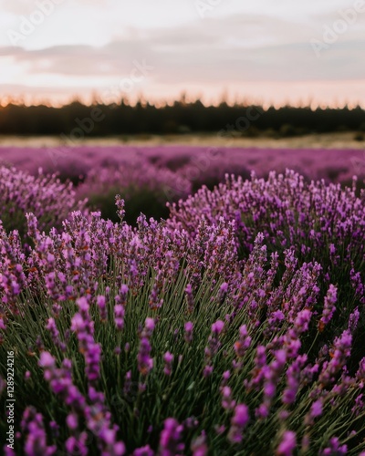 © xbzz, Naklejka premium Lavender fields blooming at sunset nature landscape scenic viewpoint tranquil environment