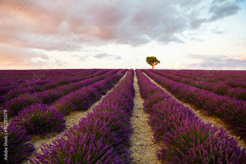 Naklejka premium Lavender fields near plateau Valensole in Provence, France. Stunning view with a beautiful lavender field at sunset.