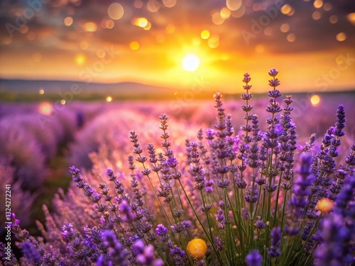 Naklejka premium Lavender Fields Sunset: Bright Purple Flowers, Golden Hour, Bokeh Sky - Stock...