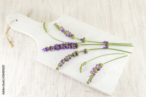© creativefamily, Fototapeta premium Lavender flower branches on wooden tray