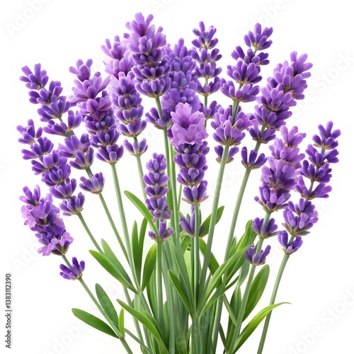 © arshed, Fototapeta premium Lavender flower, single sprig of lavender in full bloom, hyper-realistic, ultra-detailed purple blossoms with soft green stems, soft natural lighting, high resolution, white background,