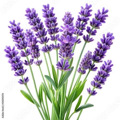© arshed, Naklejka premium Lavender flower, single sprig of lavender in full bloom, hyper-realistic, ultra-detailed purple blossoms with soft green stems, soft natural lighting, high resolution, white background,