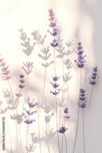 © BerkahStock, Naklejka premium Lavender flowers and shadows against a white background.