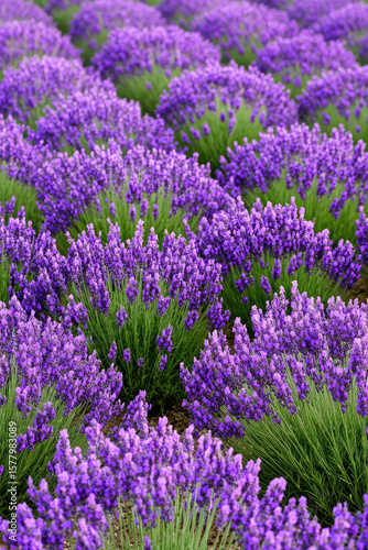 Naklejka premium Lavender flowers are blooming in a field, creating rows of vibrant purple. Nature, floral beauty, tranquility, agriculture