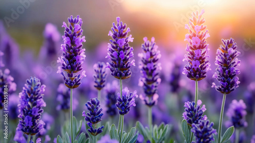 Fototapeta premium Lavender flowers blooming in a field at sunset