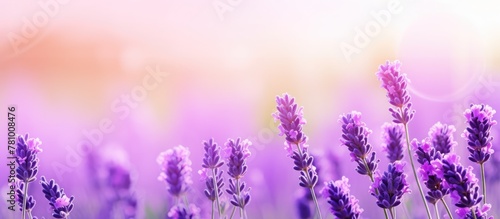 Naklejka premium Lavender flowers blooming in a picturesque field with a beautifully blurred background creating a serene scene