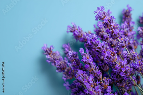 Obraz premium Lavender flowers grow and create a calming atmosphere in a simple setting with a blue background