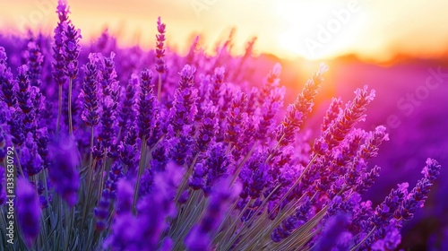 © Nuri_Studio, Naklejka premium Lavender flowers in a field glow with a warm, colorful sunset in the distance