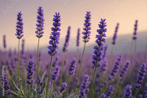 © haiqiang, Naklejka premium lavender flowers in a field with a mountain in the background