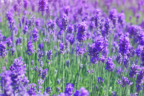 Naklejka premium Lavender flowers in purple-pink light. A field with flowers. Summer sunny background. Beauty in nature.