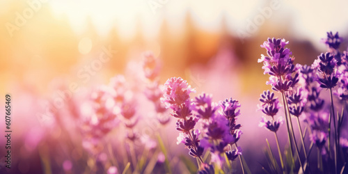 Naklejka premium Lavender flowers in the sun. Lavender field at sunset. Beautiful Floral background for greeting card for Mother's day, Birthday, Womens day, Wedding. Generative ai illustration