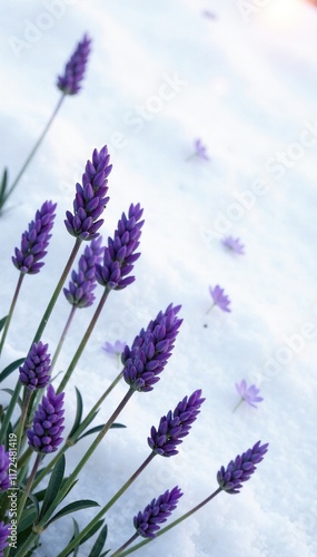 Obraz premium Lavender flowers scattered on a snowy white surface, peaceful landscape,...