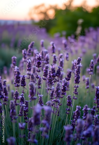 © Mehdi, Naklejka premium Lavender Garden Sunset. Purple Flowers Gently Sway In A Warm Breeze. Soft Light Shines Across The Field. A Beautiful Serene Landscape For Contemplation And Peace.