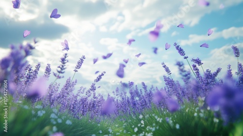 © Chatchanan, Naklejka premium Lavender petals drifting through the air in a tranquil spring meadow
