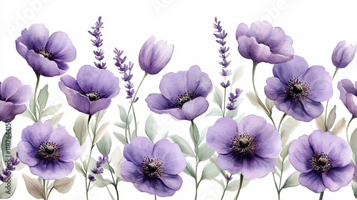 © Suparerk, Fototapeta premium Lavender & Purple Anemone Watercolor Floral Border