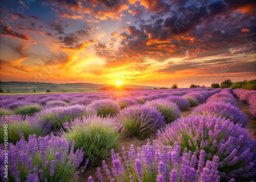 © Man888, Obraz premium Lavender Sunset: Aromatic herbs, twilight hues, soft purples and oranges, serene atmosphere