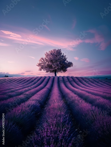 © Andrew, Fototapeta premium Lavender Sunset Serenity: A solitary tree stands sentinel over rolling hills of vibrant purple lavender, bathed in the soft glow of a breathtaking sunset. A tranquil scene of natural beauty.