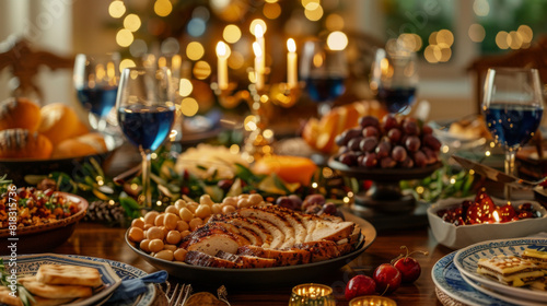 © khonkangrua, Naklejka premium Lavishly decorated holiday table with candles, festive lights, and a spread of traditional dishes and fruits.