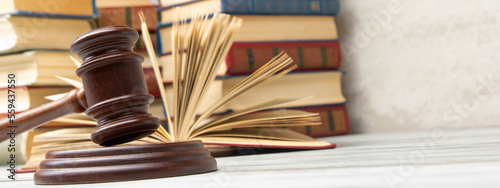 © projectio, Obraz premium Law and justice concept. Mallet gavel of the judge, scales of justice, books. Copy space for text