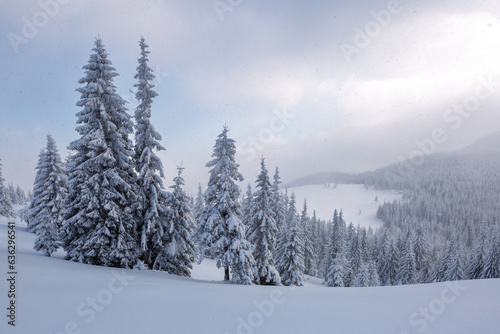 © Vitalii_Mamchuk, Fototapeta premium Lawn and forest. Winter landscape. High mountain. Trees covered with white snow. Snowy background. Nature scenery.