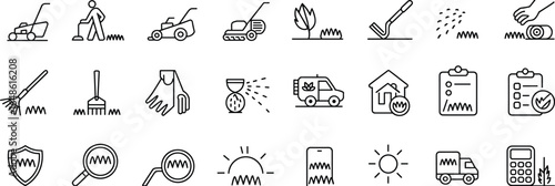 Naklejka premium Lawn care service icons with mower rake gloves and delivery van lawn mower...