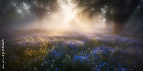 Naklejka premium Lawn in the botanical garden blooming with blue flowers in the morning mist at dawn. AI generation
