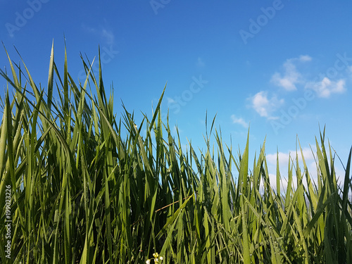 © sea and sun, Obraz premium lawn meadow green blue sky for background in the morninga