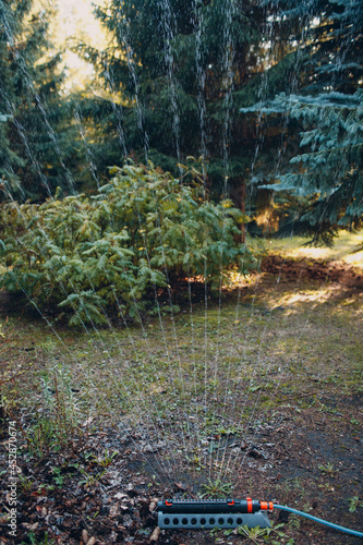 © primipil, Fototapeta premium Lawn sprinkler spaying water over green grass at garden park. Irrigation system
