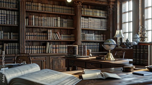 Fototapeta premium Lawyer's Office: The lawyer's office is filled with law books, case files, and legal documents, where the lawyer reviews cases and prepares for upcoming court appearances