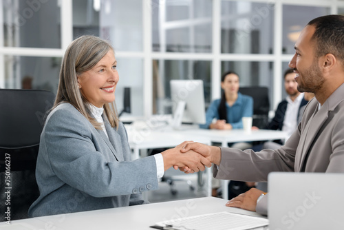 © New Africa, Fototapeta premium Lawyer shaking hands with client at table in office, selective focus