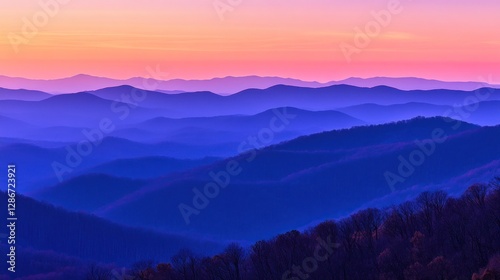 © Biancaart, Obraz premium Layered Blue Mountain Ridges at Sunset with Colorful Sky