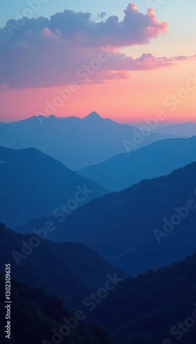 © Kraengkrai, Fototapeta premium Layered blue mountains meet the horizon under a gradient sky at dusk, earthy, atmospheric, sky
