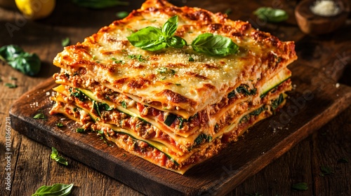 © fivan, Fototapeta premium Layered lasagna with zucchini and spinach, on a wooden cutting board, with decorative sprigs of basil and fresh lemon zest