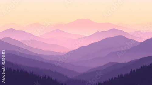 © Artastic, Fototapeta premium Layered Mountain Landscape at Sunset with Peaceful Purple Hues and Forest