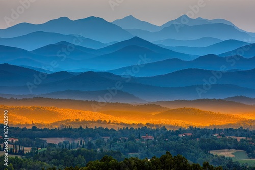 © Aupa, Fototapeta premium Layered mountain ranges in soft blues and golds