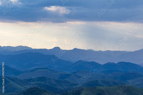 © Leonardo Araújo, Fototapeta premium Layered Mountain Ranges Under Soft Rain and Dramatic Blue Sky