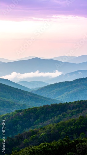 Obraz premium Layered mountain ranges with misty valleys, bathed in soft pastel hues of sunrise and sunset.