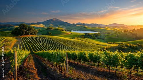 Fototapeta premium Layered paper grapevines growing along the rolling hills of a picturesque...
