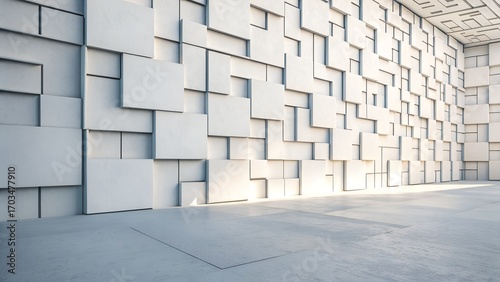 © Ramani, Fototapeta premium Layered Rectangles in Sunlit Interior – Architecture, Minimalist, Abstract, Texture, Light and Shadow, Modern Design