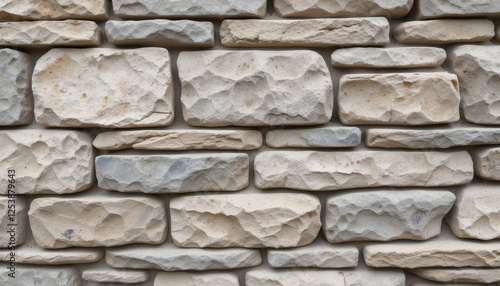 Fototapeta premium Layered stone wall texture with irregular rocks and visible mortar details