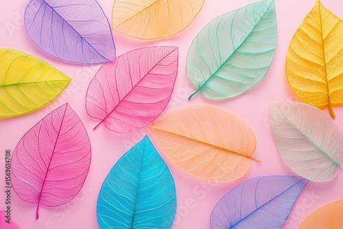 Naklejka premium Layered translucent leaves in rainbow hues, ethereal background, 3D...