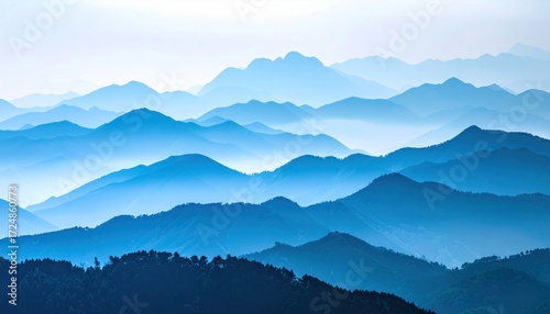 Fototapeta premium Layers of blue mountain ridges receding into a hazy, distant horizon create a sense of depth and serene natural grandeur
