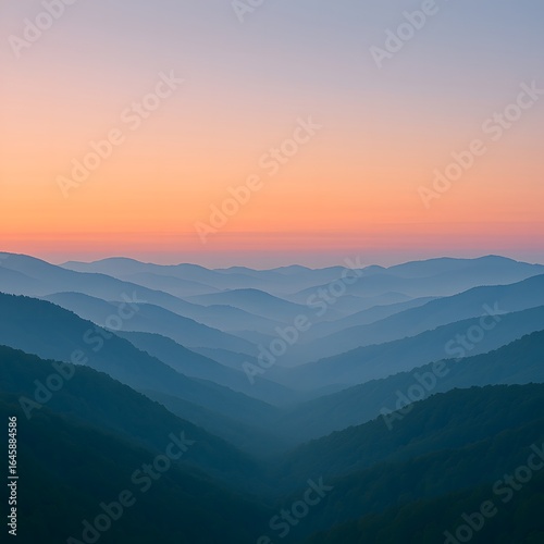 © bi, Obraz premium Layers of blue mountains fading into the distance under a soft sunrise sky.