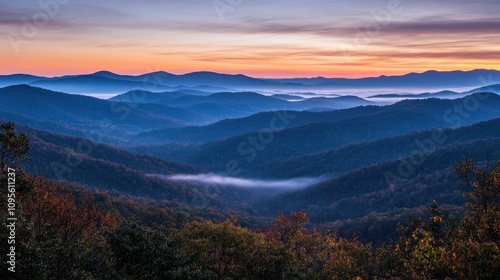Obraz premium Layers of misty mountains at dawn with vibrant colors in the sky